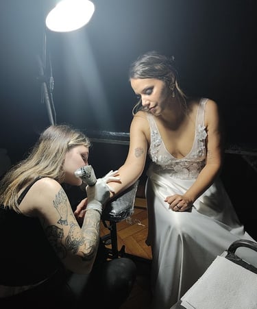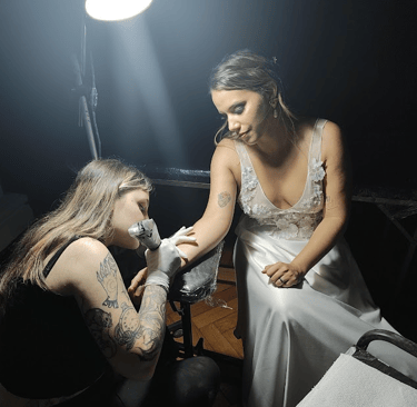 Preparar su boda con nuestro Stand fue todo un aprendizaje: adaptamos cada detalle para que encajara con la estética de su evento y asegurarnos de que los invitados tuvieran una experiencia divertida y única. Fue increíble ver cómo todos disfrutaban eligiendo sus tatuajes, animándose y llevándose un recuerdo inolvidable.